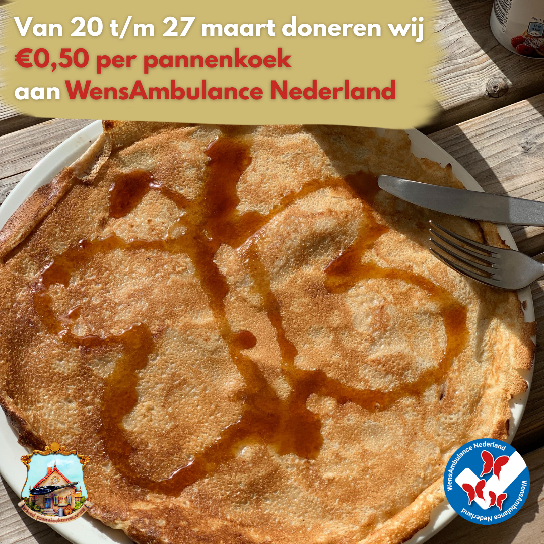 Op vrijdag 20 maart 2026 is het Nationale Pannenkoekdag. Deze toch al speciale dag krijgt dit jaar een extra bijzondere lading. In de week van 20 tot en met 27 maart doneren 36 pannenkoekenrestaurants verspreid door heel Nederland €0,50 van iedere verkochte pannenkoek aan WensAmbulance Nederland.